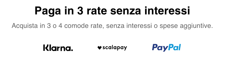 Al momento del checkout, seleziona Klarna o Scalapay come metodo di pagamento. Il totale verrà suddiviso in 3 rate mensili addebitate automaticamente sulla tua carta senza costi aggiuntivi.